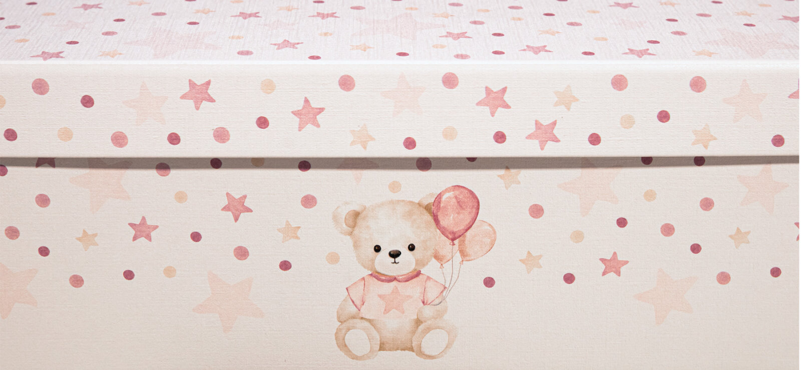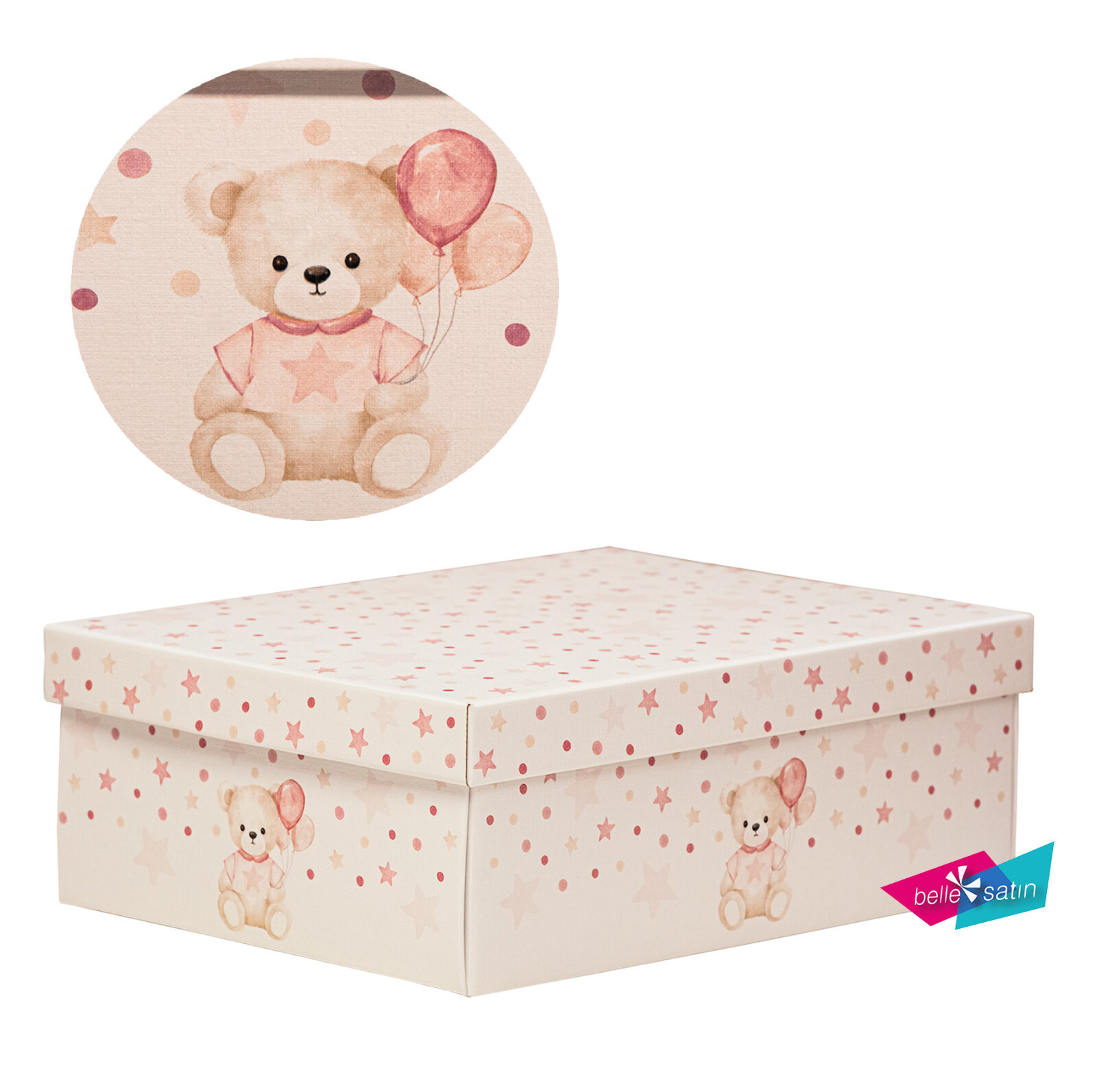 elegantní dárková krabice s dětským vzorem hvězdiček a medvídka v růžovém tónování